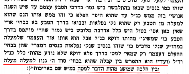 It will be interesting to note (for those who have learned the Sicha explaining the “New Torah That Will Go Forth From Me”) that the Rebbe references chapter 16 in Shaar HoEmuna by the Mitteler Rebbe. There, the Mitteler Rebbe explains this same subject of miracles, and also the difference between the aspect of concealment within the Ohr Ein Sof (למעלה מעלה עד אין קץ), and the aspect of revelation (למטה מטה עד אין תכתית). He brings out that these two aspects correspond to Halacha (revelation to the lowest levels) and Kabbala (hidden secrets above revelation). Through this reference we can tie together everything in our maamor (which seems to be speaking only about miracles and wonders in physical objects) with the concepts discussed in the Sicha explaining the “New Torah That Will Go Forth From Me” — the ability of Moshiach to draw down the loftiest secrets of Torah to the point where they become Halacha!